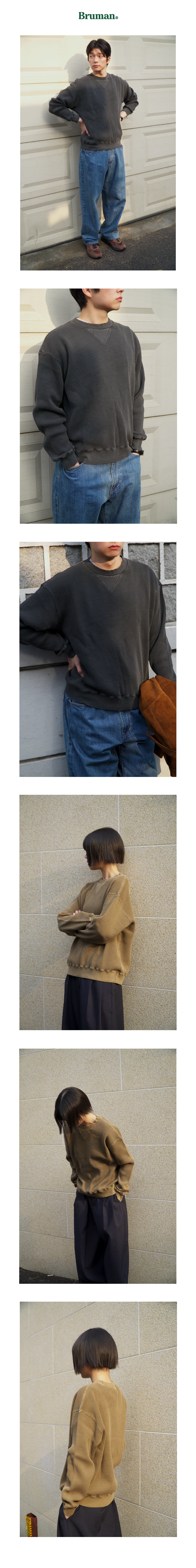 전면부 삼각 거셋과 데미지 디테일을 더해 오래 입은 스웻셔츠에서 느껴지는 분위기를 담았습니다.